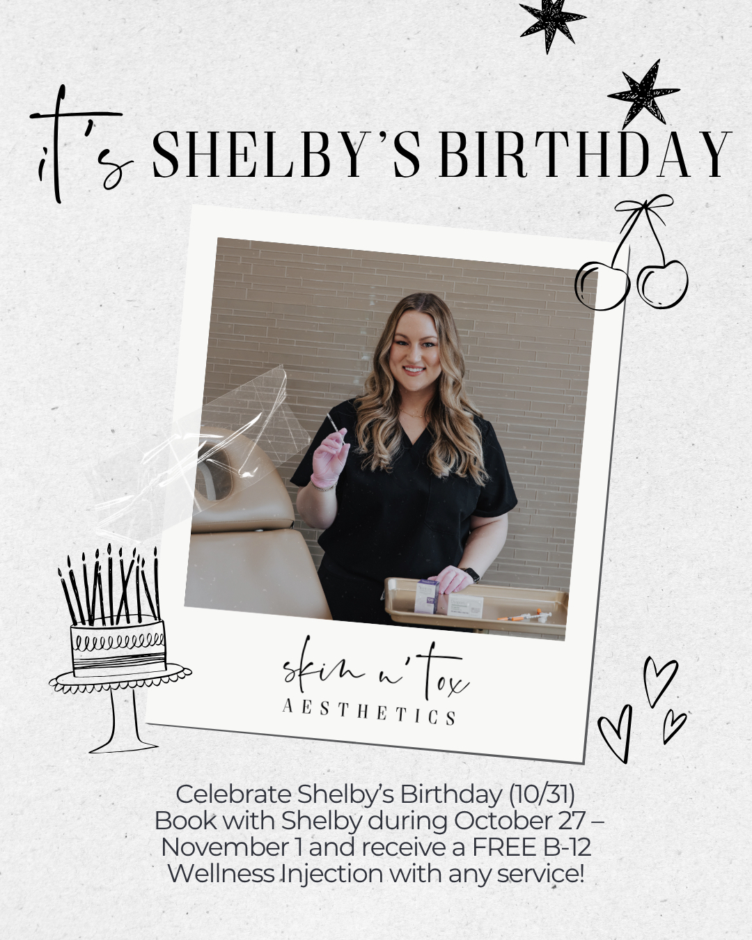 Book with Shelby during October 27 – November 1 and receive a FREE B-12 Wellness Injection with any service.